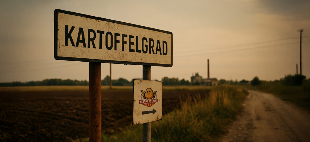 Hier, le village a connu son grand frisson rouge & jaune. Sous les néons héroïques de la Maison du Peuple, Joseph Barakafritz (notre camarade Ministre des Sports et de la Jeunesse) a déroulé un discours-fleuve, mais chaleureux comme une poutine en hiver. Il a proclamé la naissance du Spartak Kartoffelgrad, un club de football permettant à quelques-uns d’entre nous de disputer deux matchs par semaine.